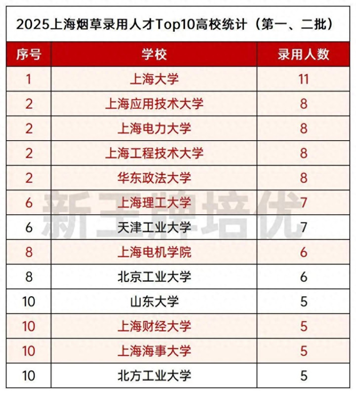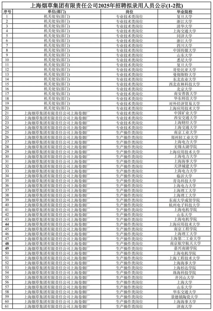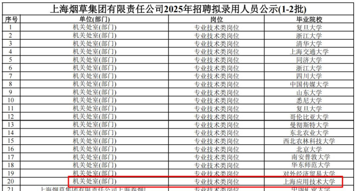 2025年上海烟草第一批和第二批共录取246人,录取的考生来源于127所高校,其中本地的上海大学有11人直接排在了首位,紧随其后的上海应用技术大学有8人,表现也十分亮眼!上岸的还有部分985高校比如清华大学、浙江大学、复旦大学等高校的毕业生。